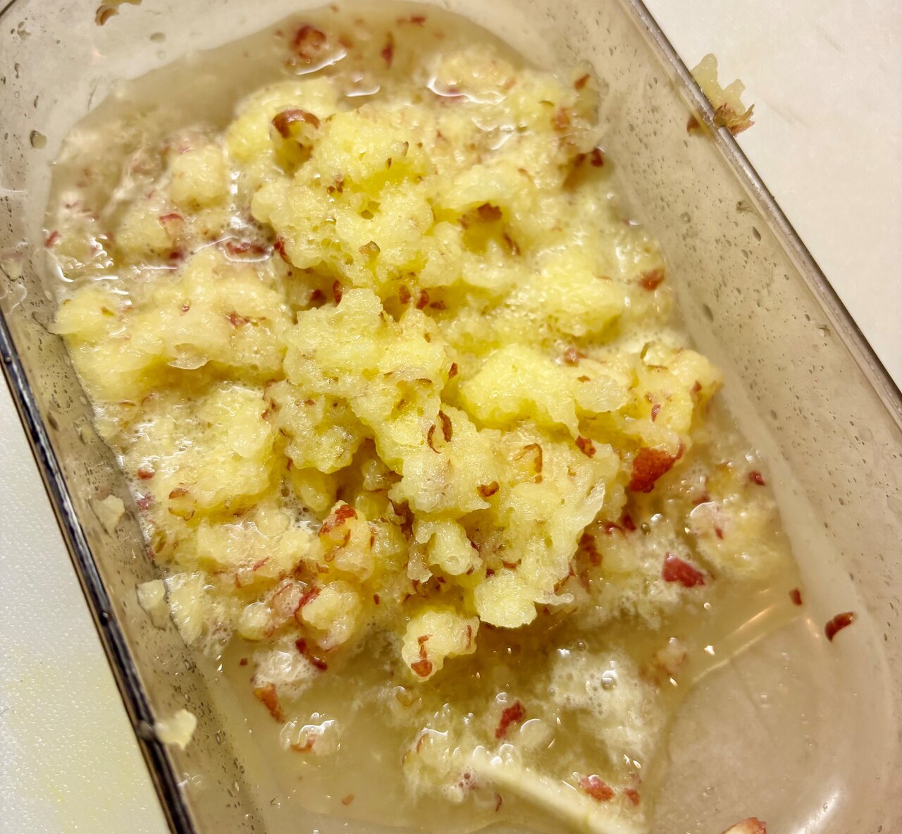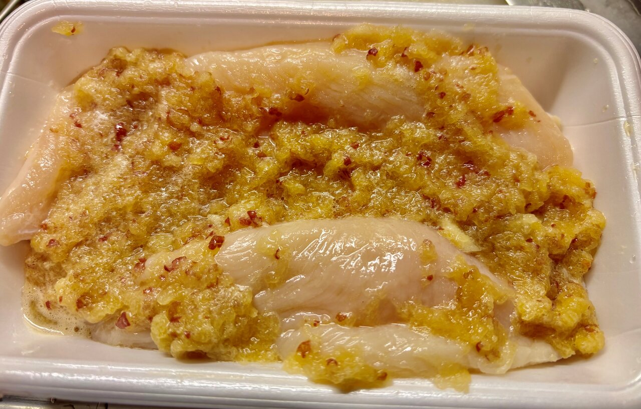 ③そのむね肉をすったリンゴに浸してください。パサパサするむね肉ですが、リンゴの酸味でしっとりとなります。