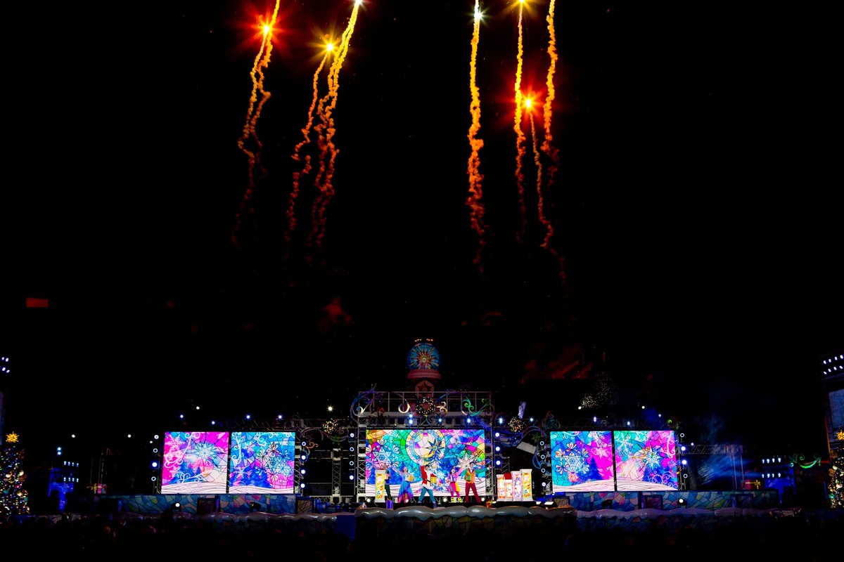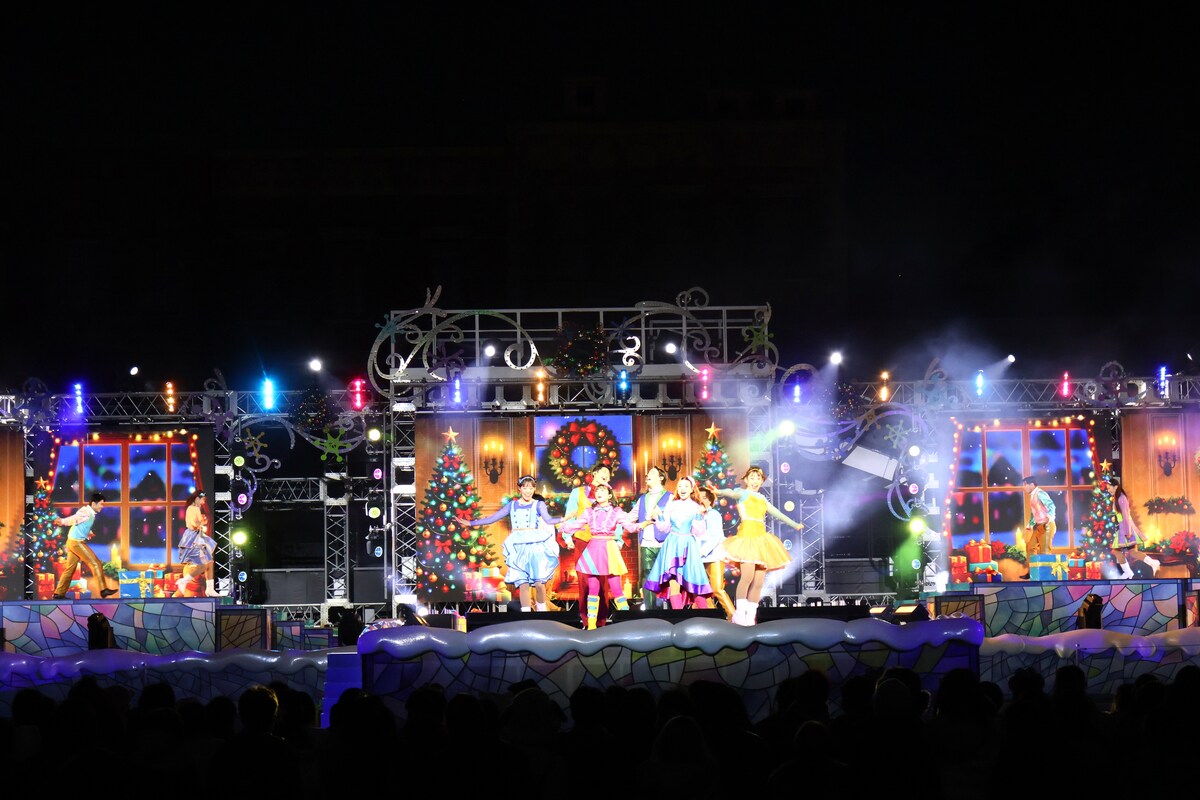 目玉の一つは、夜のパークを一気に幻想的な世界へと誘うクリスマス・ナイト・ショー『ライト・アップ・ザ・ナイト ~クリスマス・セレブレーション~』です。ハローキティやセサミストリートの仲間たちが登場し、エンターテイナーたちと一緒にクリスマスソングを歌い、踊ります。来場者にスマートフォンのライトを点灯するよう呼びかけるクライマックスでは、粉雪が舞う中、パイロ(花火)が夜空を彩り、来場者からは感嘆の声が上がっていました。ショーは、2026年1月4日まで1日2回、開催されます。