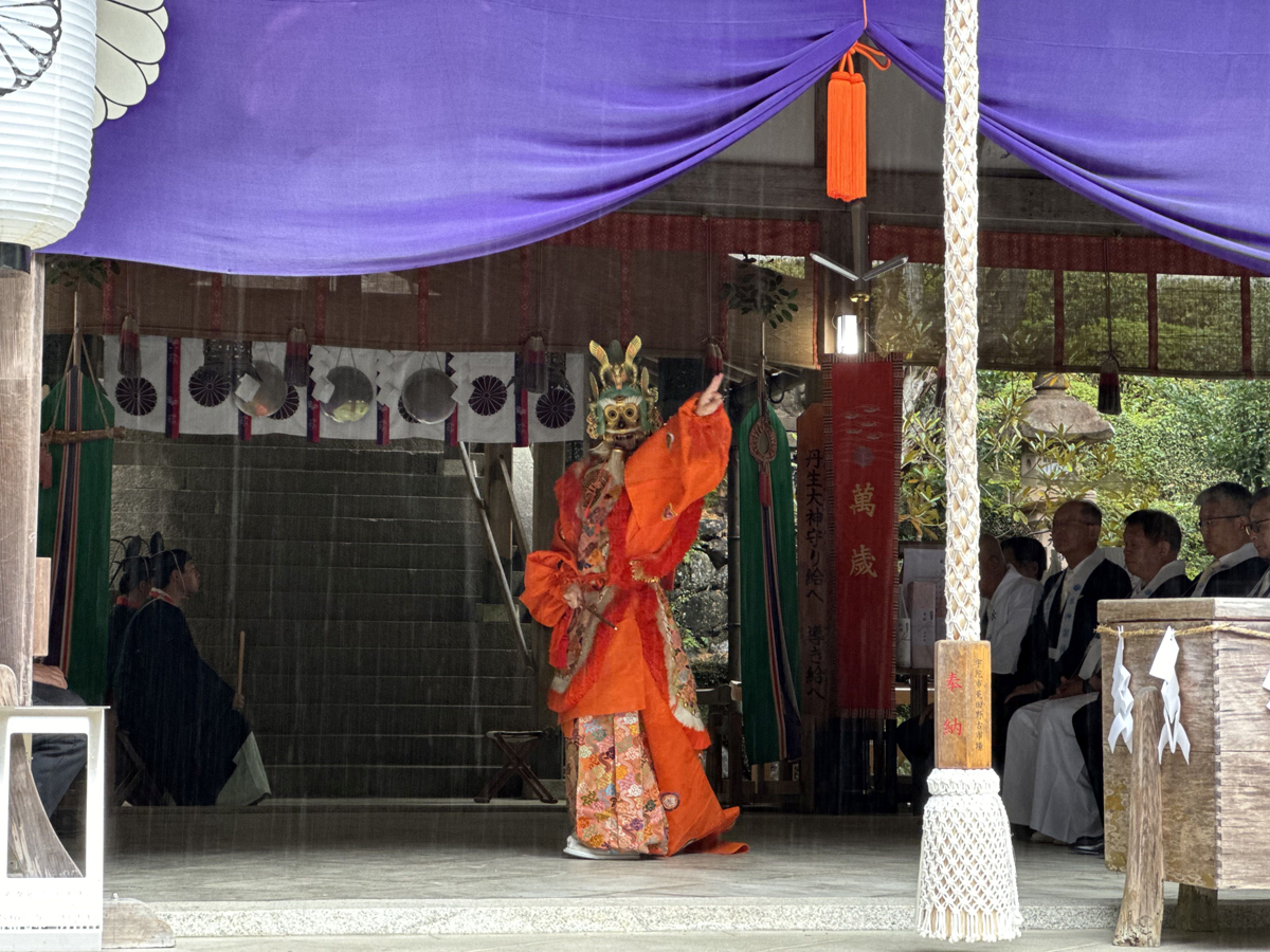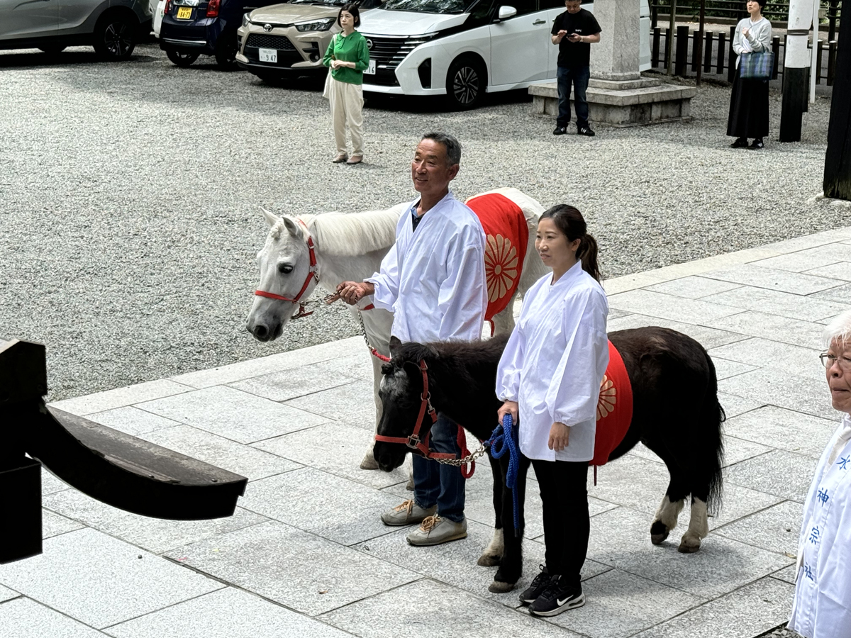 6月4日に行われる「水神祭」と、10月16日の「例祭」に、神馬が登場します。「水神祭」は、豊かな水に恵まれることを祈ります。「例祭」は、「国家・国民の安泰、地域の繁栄、五穀豊穣と神さまへの感謝の祈りを捧(ささ)げるお祭り」で、黒馬と白馬が献上されます。