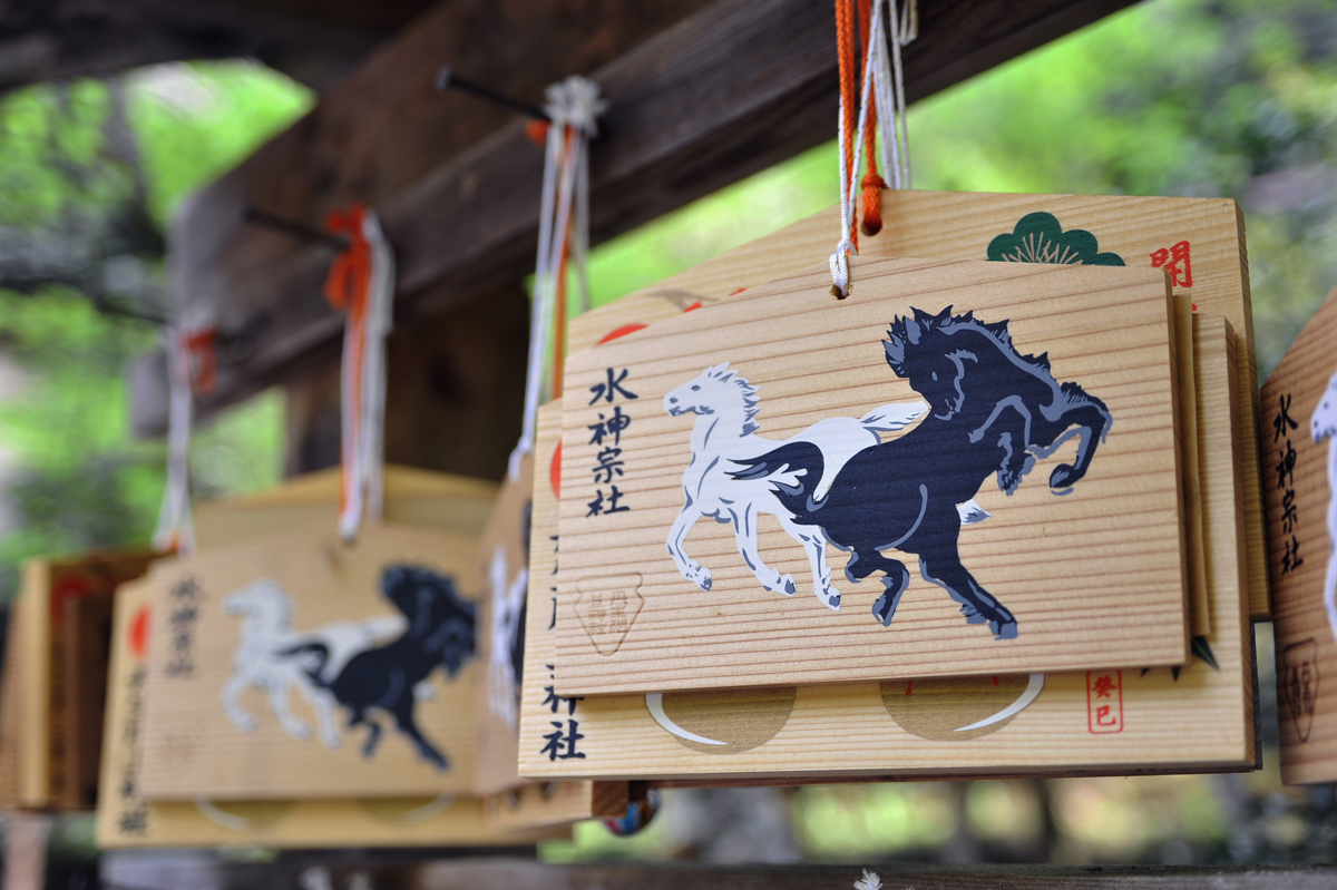 日照りには黒毛の馬を、長雨には白毛の馬を水神に献上することを慣例としたのがこの「丹生川上神社」で、これが後の絵馬の起源となったと言われています。そのため、「絵馬」発祥の地の一つとされています。