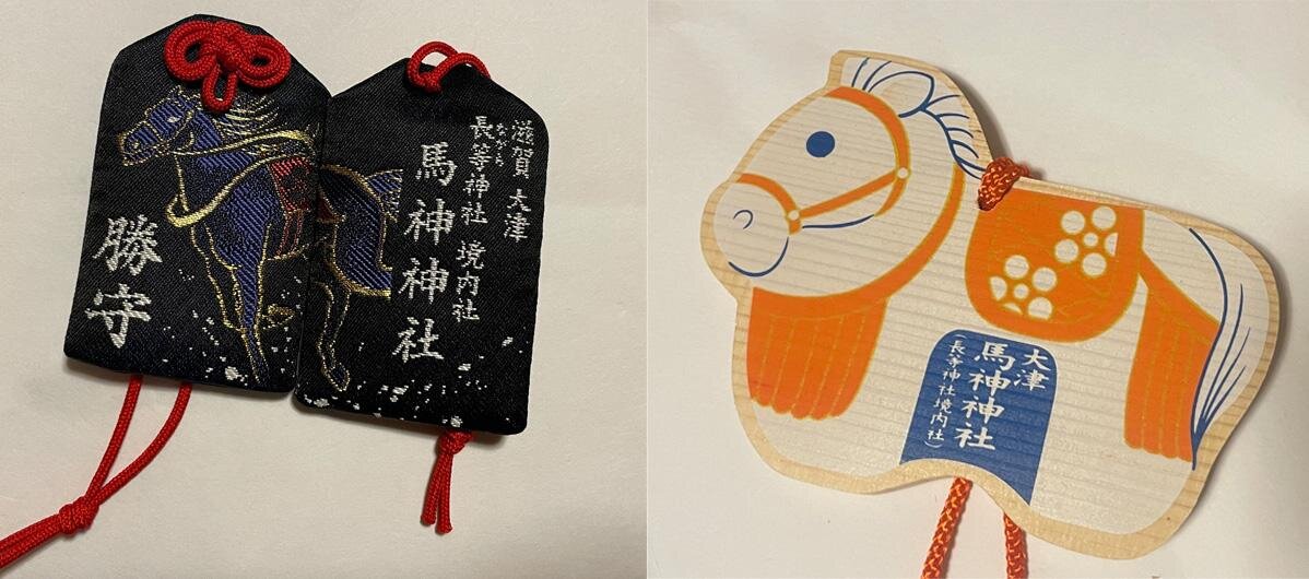 馬神神社のお守りは、黒地に力強く駆ける馬が刺繍(ししゅう)された「勝守」やストラップ型の「馬蹄守」があります。馬の形に切り抜かれたかわいらしいデザインの絵馬も用意されています(各1,000円)。
