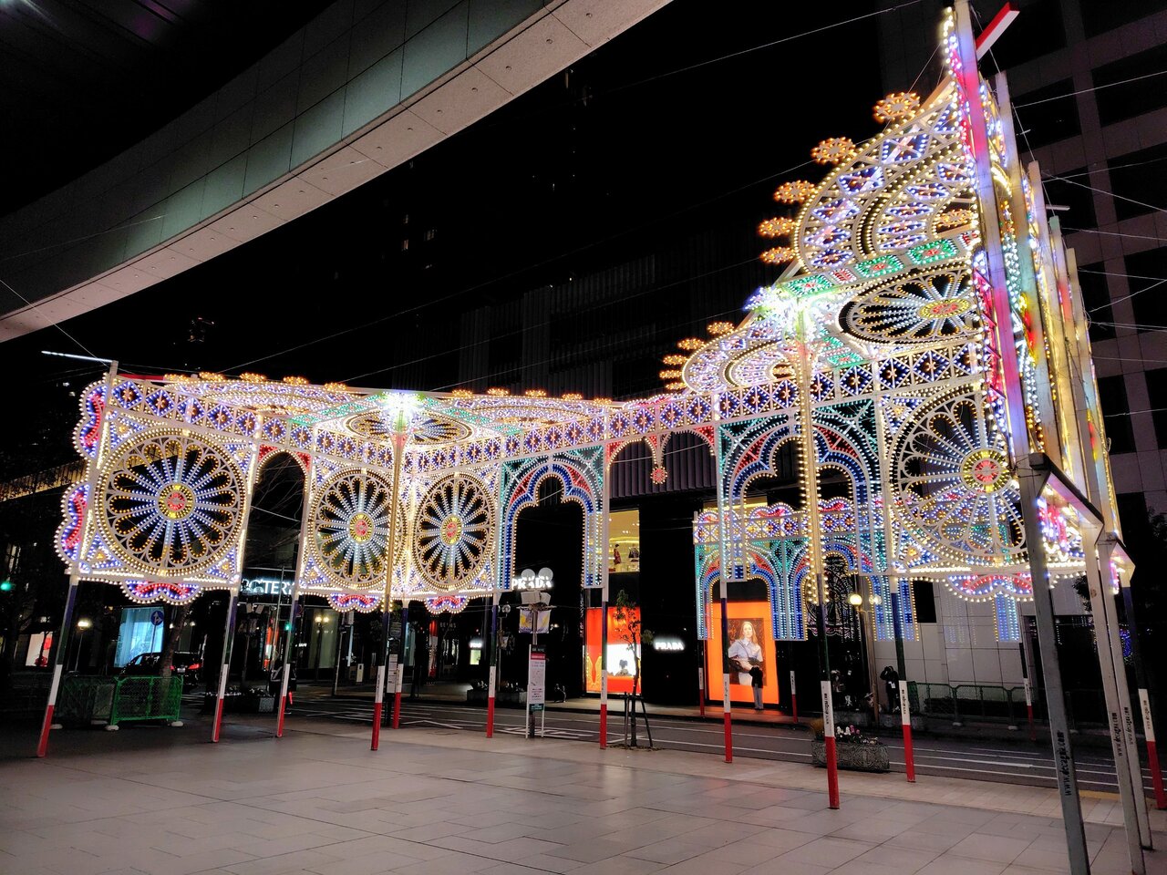 東遊園地からほど近い旧外国人居留地では、三井住友銀行神戸本部ビル前に、光の箱型作品「ドッピオガゼボ」が姿を現しました。広場を囲むように、高さ約7メートル、幅約16メートルの「オペレッタの劇場」が、まるで宝石箱の中にいるように、観客を包み込みます。旧居留地の街並みと光の共演は、思わず足を止めたくなる美しさです。