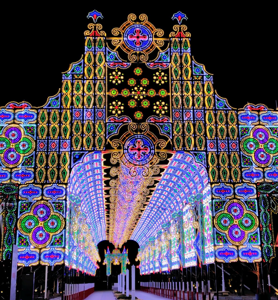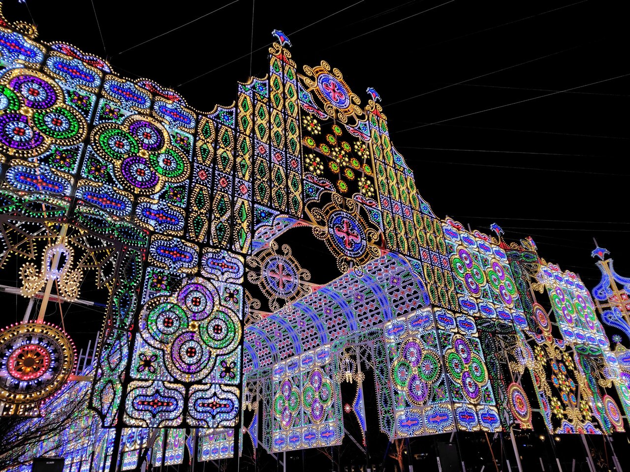 東遊園地芝生広場には、聖堂建築をイメージした光の壁かけ「スパッリエーラ」(全長約50メートル、高さ22メートル)が登場。午後6時半にあった点灯式では、「きれい」「すごい」と歓声が上がり、訪れた人たちを一気に非日常の世界へと誘っていました。