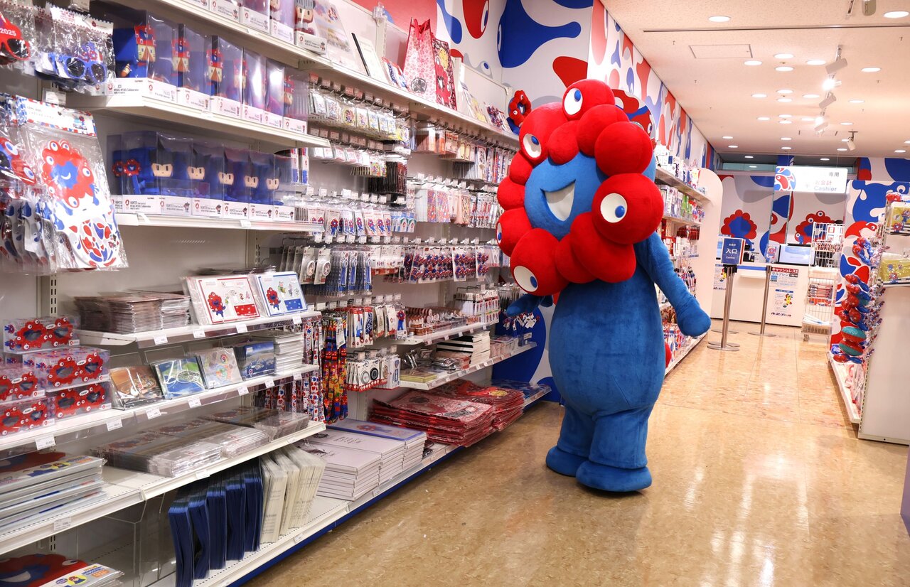 リニューアルオープンのこの日は、開店前にミャクミャク本人も来店。うれしそうに店内を見渡して、棚に並ぶグッズをじっくりと見学していました。さらに、ふれあい広場では、ボードに描かれたポーズを指さしながら、同じポーズを披露し、報道陣の頬を思わず緩ませていました。