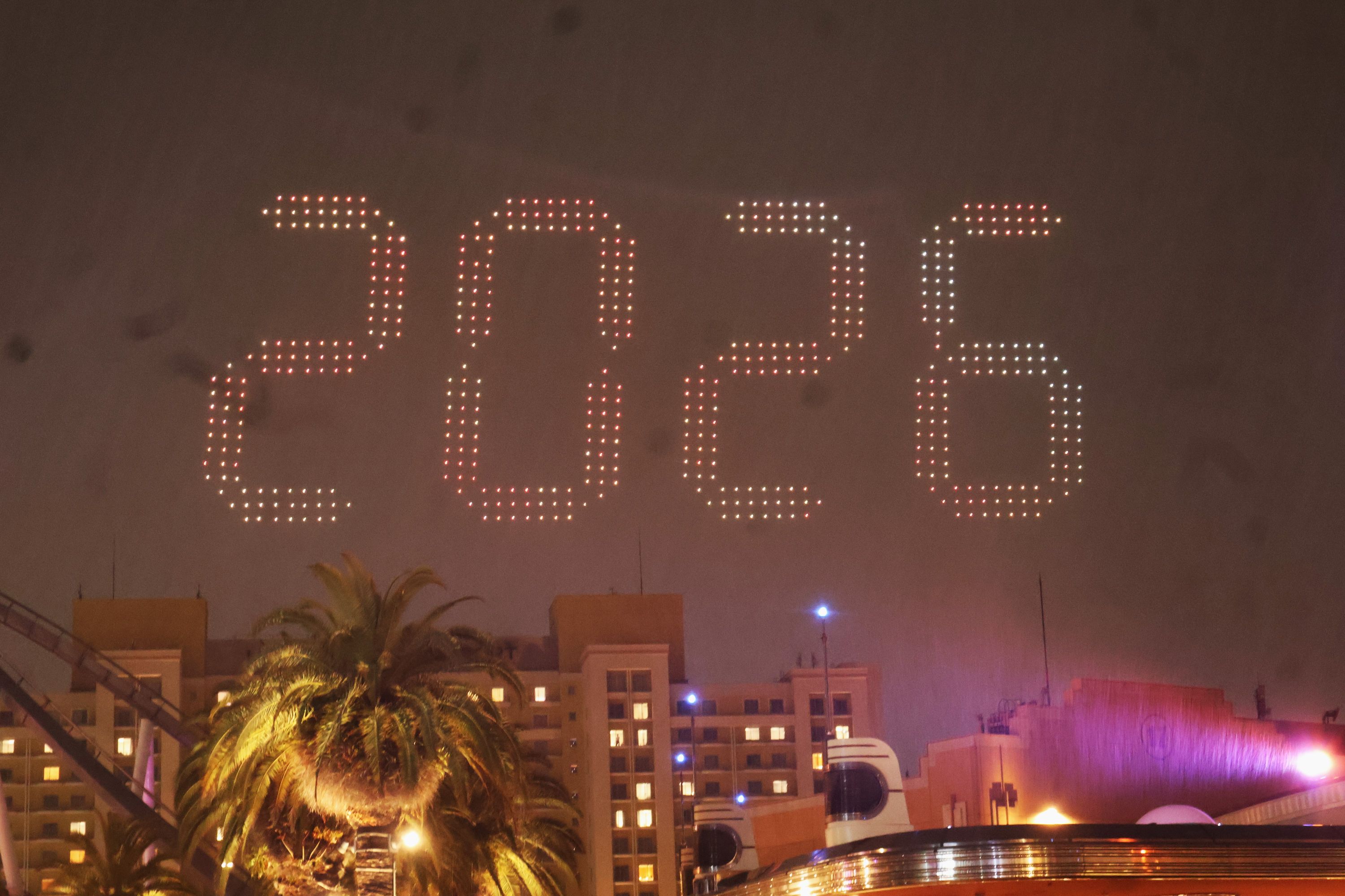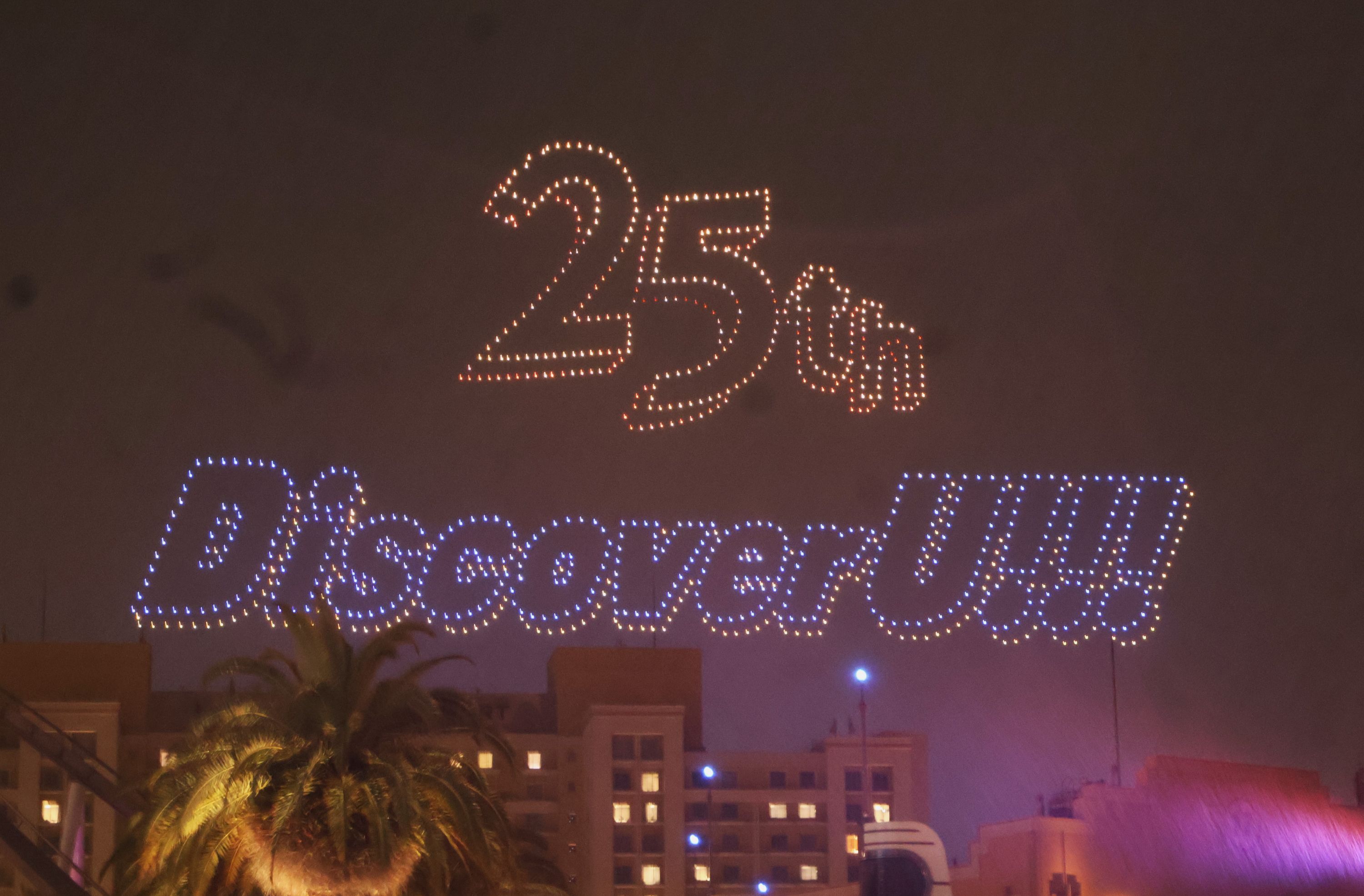 ショーの舞台となったのは、パークの象徴「ユニバーサル・グローブ」付近の夜空です。暗闇が広がる中、ドローンが舞い上がり、映し出されたのはウッディーとウィニーが手を振る姿。続いて、パークが誕生した2001年から現在までをカウントアップ。そしてラストには、「25th」と「Discover U!!!」の文字が鮮やかに浮かび上がりました。