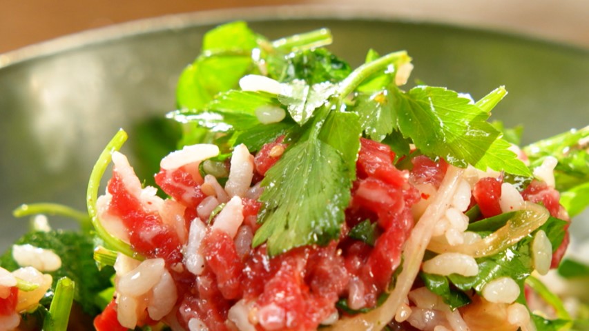 韓国で美肌野菜として親しまれているヘルシー食材“セリ”と美味しいお肉が食べられる河野(JO1 )行きつけのお店「ヌンドンミナリ」では、ユッケビビンバを頬張ったやす子が「うまっ!マシソヨー!(韓国語で「おいしい」)」と満面の笑みを見せる。
