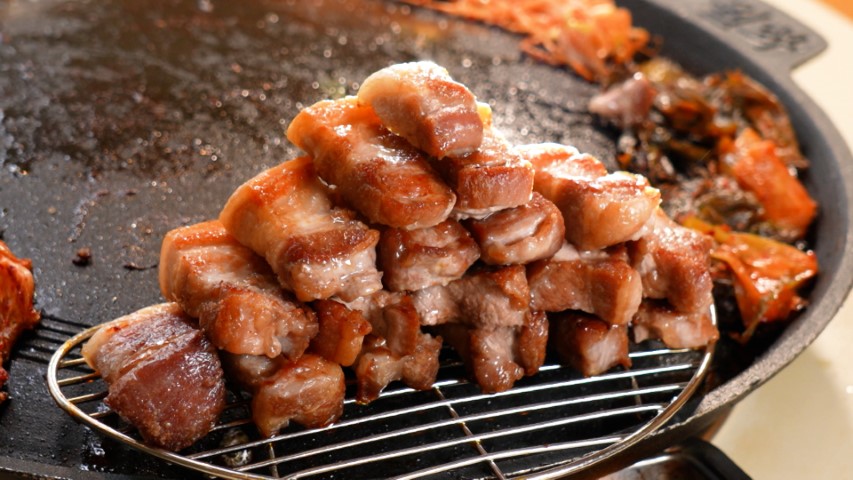 さらに、「ウォルファシクタン(月火食堂)」では、黄色い塊に包まれた進化系サムギョプサル(豚バラの焼肉)が登場。