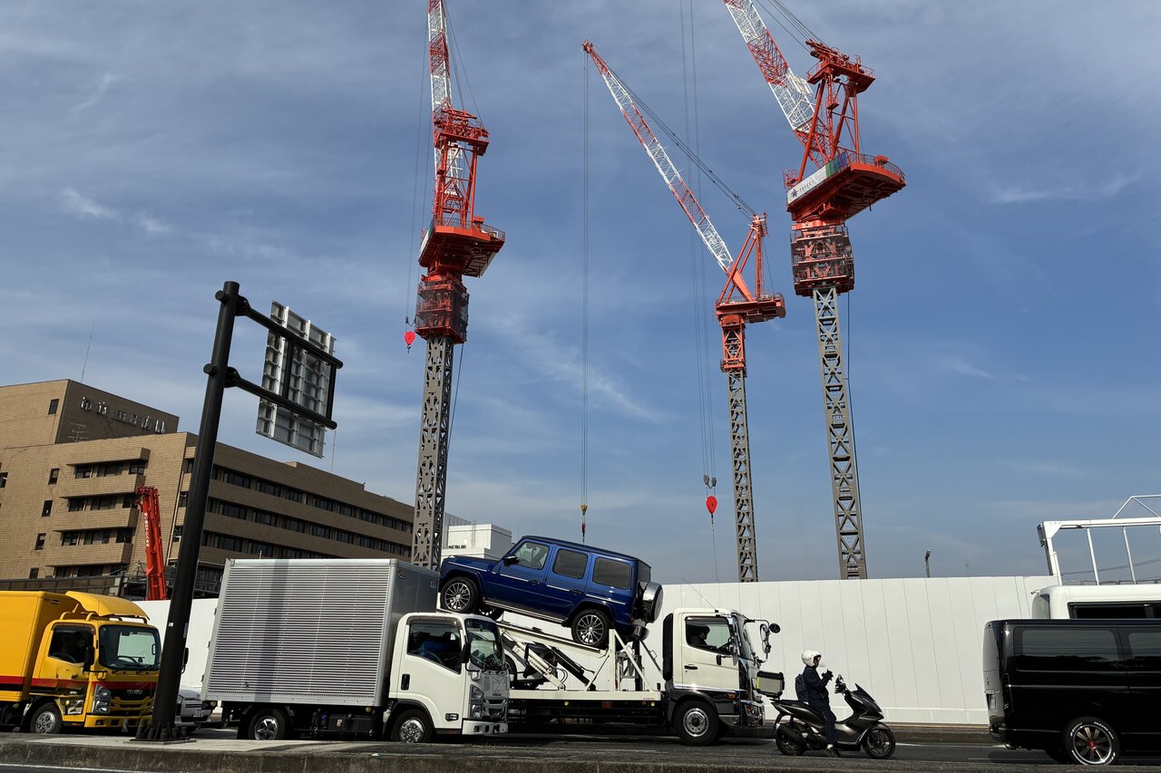 クレーンが立つ建設現場の前で