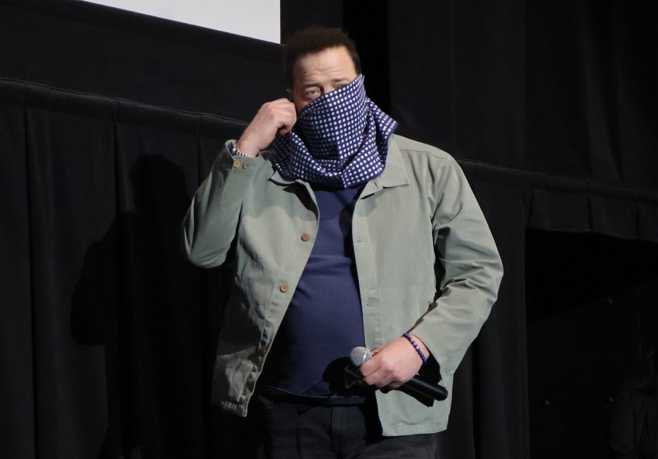 顔を隠してサプライズ登場したブレンダン・フレイザーさん(2月5日、大阪市北区)